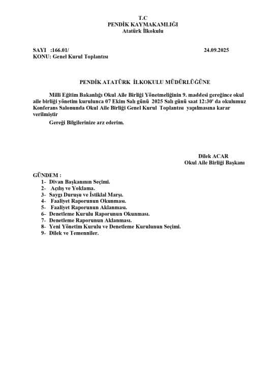 07 Ekim 2025 Salı günü saat 12:30' da okulumuz Konferans Salonunda Okul Aile Birliği Genel Kurul